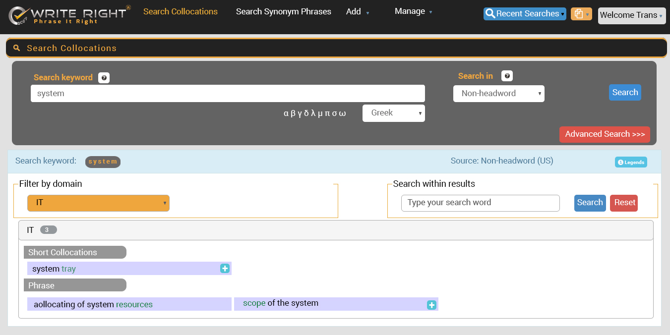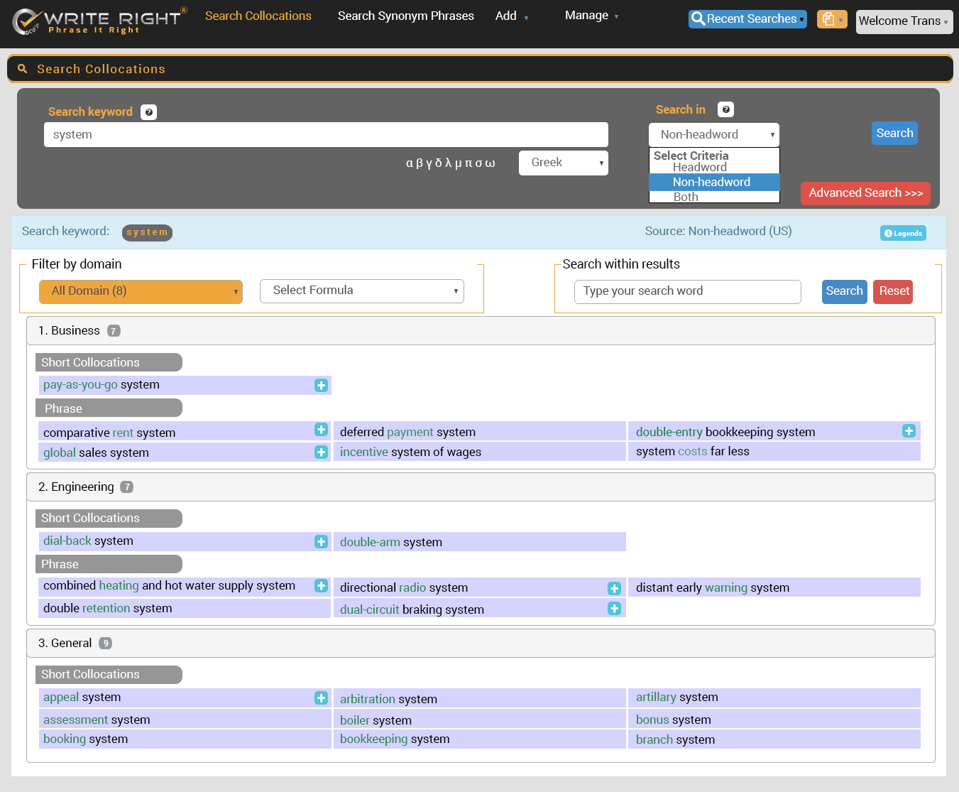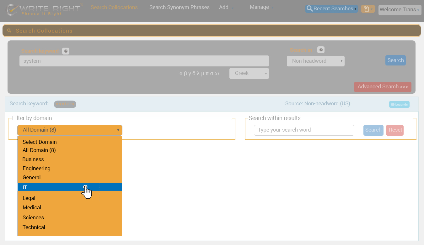 You can filter based on a specific domain. This may not produce the desired result if the search term is included under General or if the term is used in multiple domains (Business and Legal, Technical and Engineering).