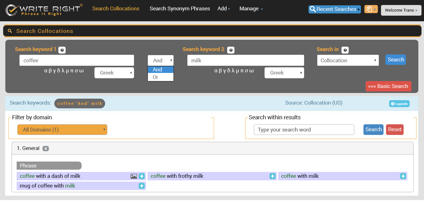 Advanced Search enables the user to search both headword and non-headword together by using the AND or OR function.