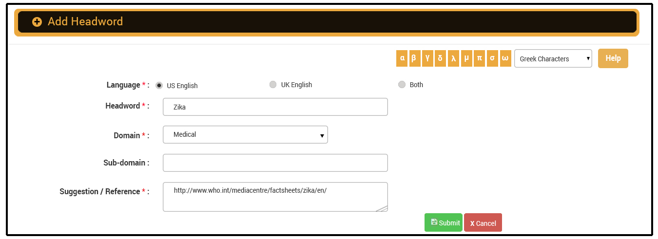 Premium users can request addition of 50 headwords per annum. Only populated headwords would be considered for the limit. This limit can be enhanced on payment of a nominal fee (dependent on the number of new headwords you request).
