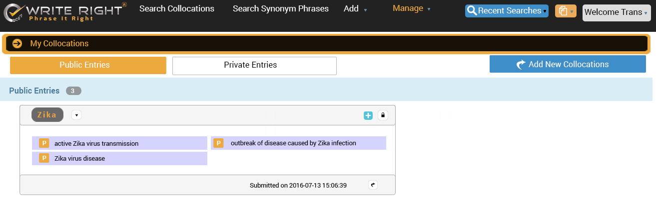 Apt Phrases can be used to find a suitable word(s) that can be a substitute for a longer phrase. This is useful when a word is on the tip of your tongue but all you can recall is its general meaning. You can search based on the general meaning (type the general word as the search word).