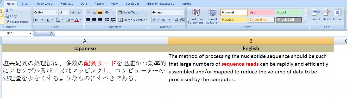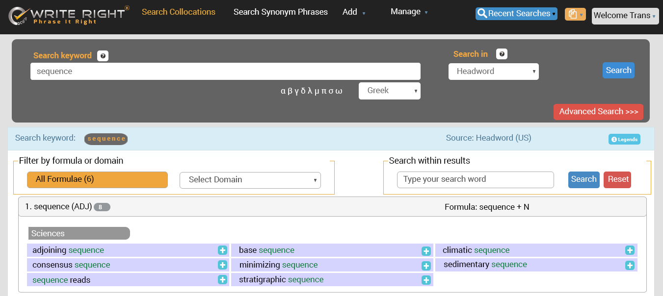 If you are unsure of a particular term or wish to confirm if such a term exists, you can type the word of which you are sure (say, sequence) and search under Both to find out all related collocations. As “sequence read” is available in the database, the translation can be assumed to be correct.