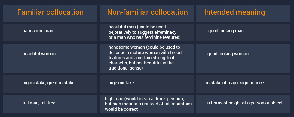 Native English speakers intuitively frame the correct collocations based on a lifetime’s experience of hearing and reading the words in set combinations; the combination of words simply feels so natural that it rolls off the tongue. The non-native speaker has a more limited experience and may frequently collate words in a way that sounds odd to native speakers.