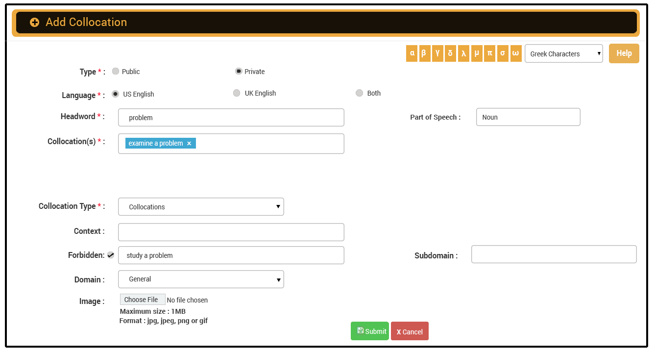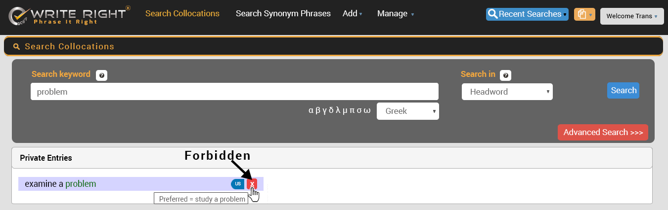 | examine a problem | study a problem | The wrong term can be included as a forbidden entry in case you add this as a Private Entry. ![]() |