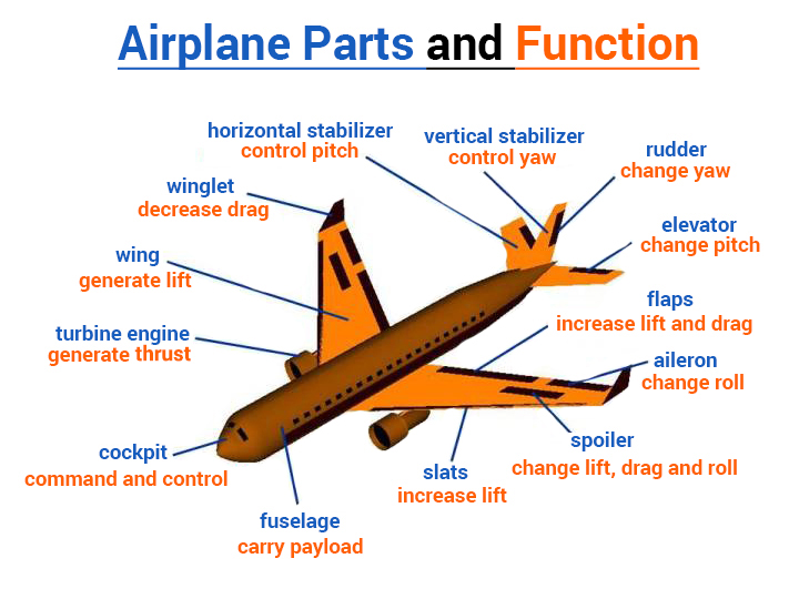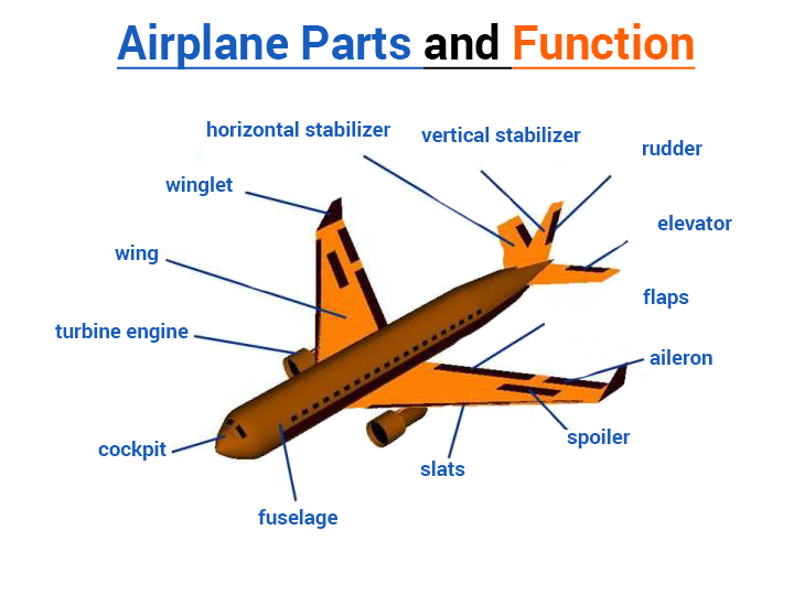 The image above shows the parts of an airplane. The airplane shown is a turbine-powered airliner which has been chosen as a representative aircraft.